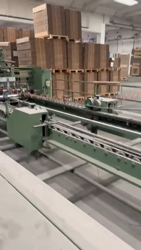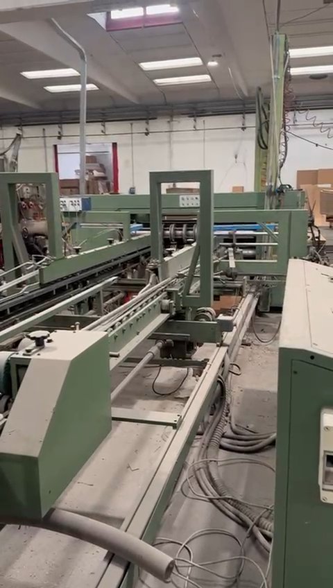 Macchinario Curioni 180 CM, completo di introduzione, stampa flexo a 2 colori dal basso e slotter con spostamento teste. Privo di fustellatore, è perfetto per linee che necessitano di stampa e taglio base su cartone ondulato.