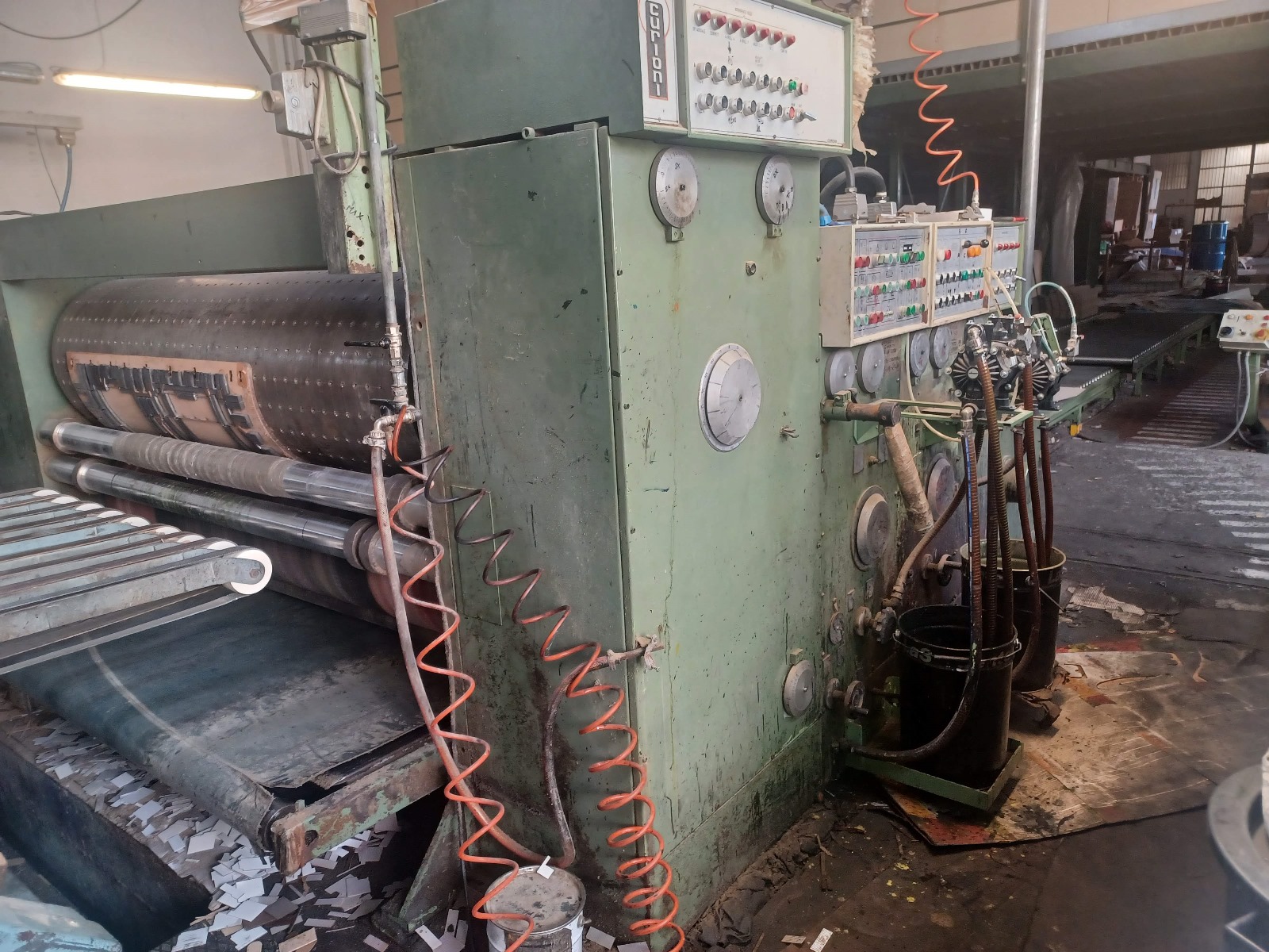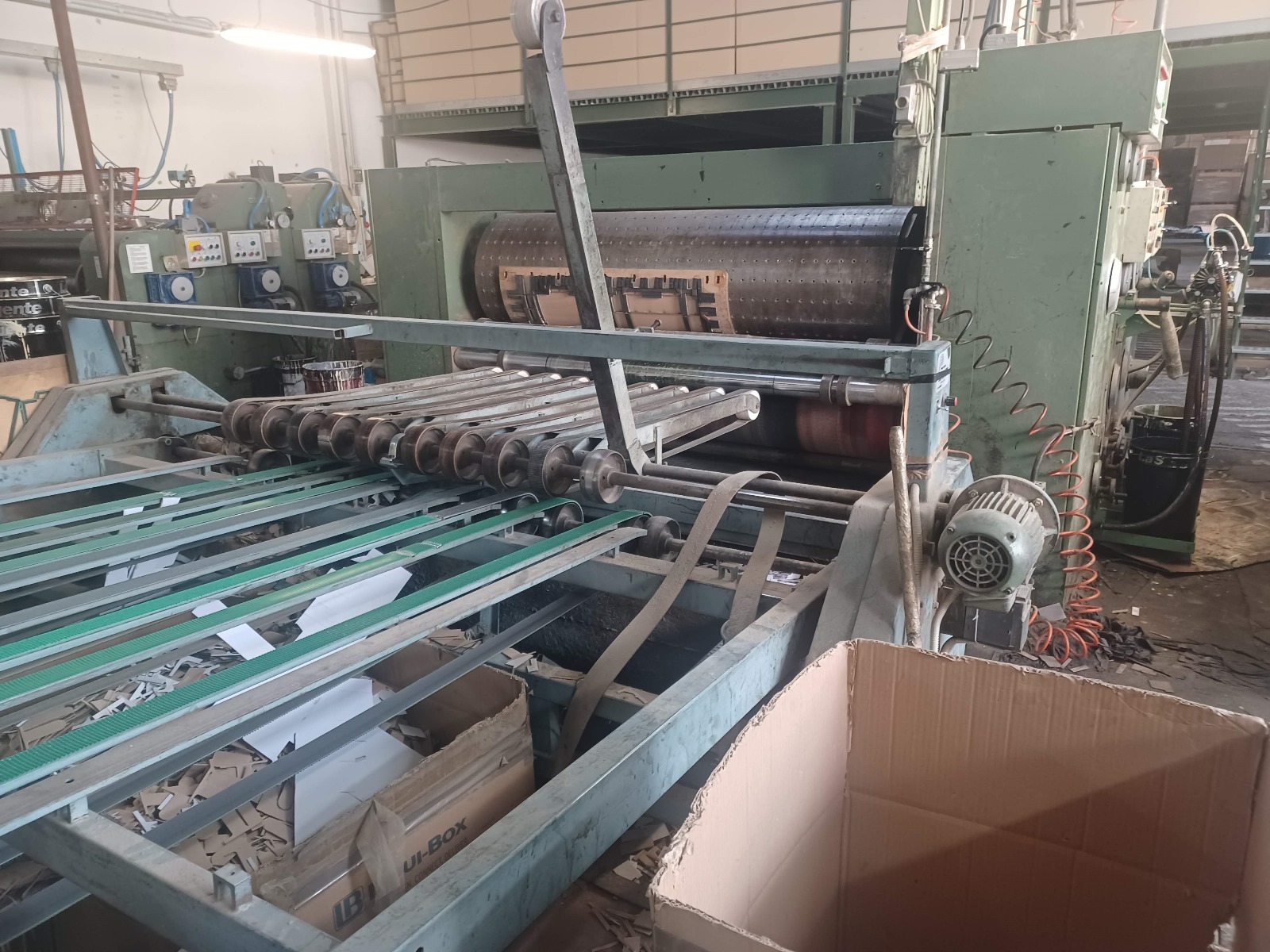 Questa macchina Curioni 220 NT, costruita nel 1994, rappresenta una soluzione efficiente e compatta per linee produttive che necessitano di stampa a 2 colori dal basso, slotter manuale e fustellatura rotativa, con impilamento finale automatizzato.